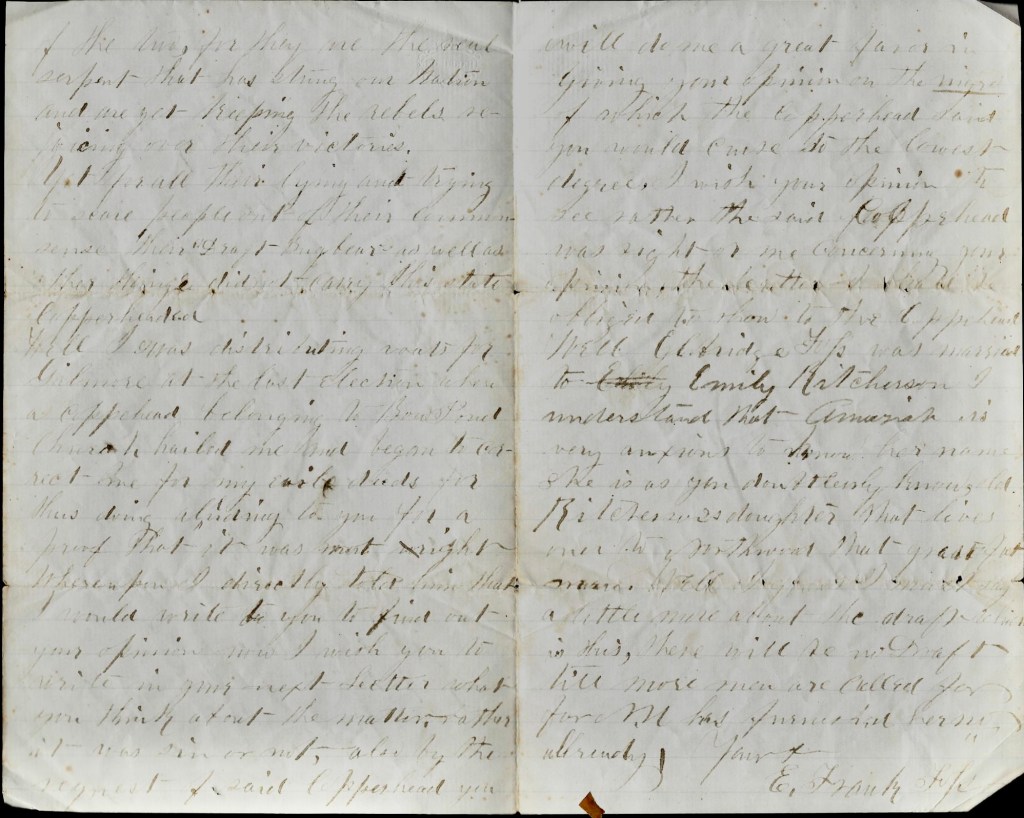 With pleasure I seat myself once more in old windy hall to write to you. I came home Friday and thus I am here and with the request of Father, undertake this note. I don’t know as I can think of much to write that will be interesting to you. You stated in your last letter to Father that you heard that the Draft was put over till July. As for the truth of such stories, none ought to vouch for there have been myriads of such stories told by the treason-sympathizing hunkers of the North, and go by the still more euphonic name of Copperheads which in my opinion is the more appropriate of the two, for they are the real serpent that has stung our Nation and are yet keeping the rebels rejoicing over their victories. Yet for all their lying and trying to scare people out of their common sense, their draft bugbear as well as other things did not carry this state Copperheaded.