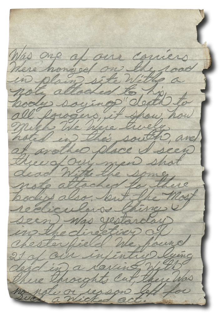 24 February 1865—Up early at seven in the morning. Our division again leading the advance. We went twenty-five miles and it was all the way in a fearful rain and I mean hard rain too accompanied massively by heavy wind and the roads are getting very rough. Some of our foragers have been badly butchered by the enemy calvary over the last few days. With such atrocities that I have witnessed with mine own eyes, make the battlefield seem like kids playing grounds. One terrible thing I witnessed was one of our couriers was hanged on the road in plain sight with a note attached to his body saying “death to all foragers.” It shows how much we were truly hated in this South. And at another place I seen three of our men shot dead with the same note attached to their bodies also. But the most ridiculous thing I seen was yesterday in the direction of Chesterfield. We found 21 of our infantry lying dead in a ravine with their throats cut. There was no note or reason left for such a wicked act.