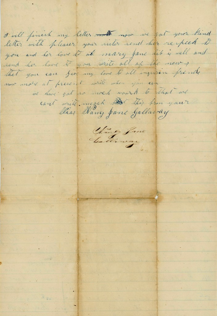 We have got so much work to do that we can’t write much. This from your cousin—Nancy Jane Gallaway