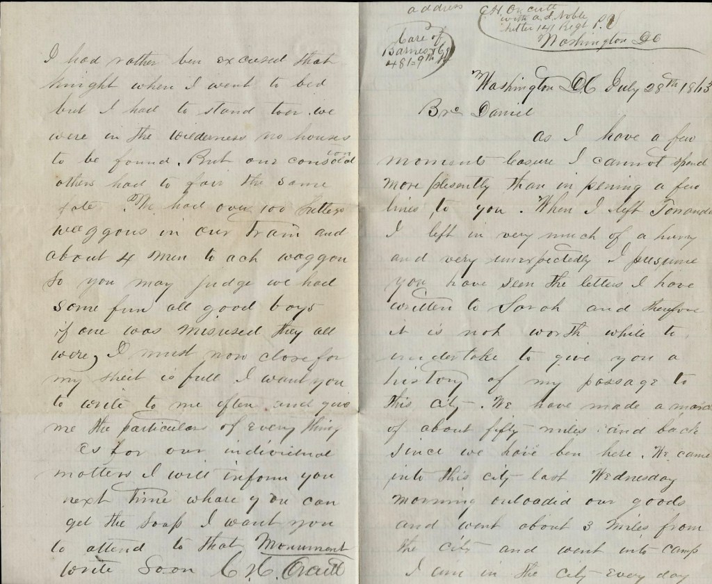 Address C. H. Orcutt with A. I. Noble, Sutler, 141st Regt. P. V., Washington D. C., Care of Barnes & Co., 481 9th Street