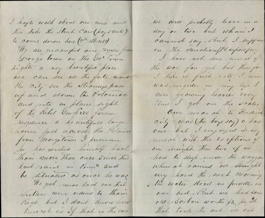 We are encamped one mile from Georgetown on the Georgetown Heights—a very beautiful place. We can see all the forts around the city, see the steamers pass up and down the Potomac, and right in plain sight of the Reb. Gen. Lee’s former residence—a very beautiful large house just across the Potomac from Georgetown. I presume he has wished himself back there more than once since this last raid in Pennsylvania and be situated as once he was.