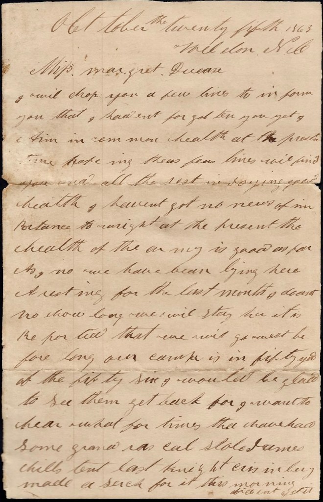 I haven’t got no news of importance to write at the present. The health of the army is good as far as I know. We have been lying here a resting for the last month. I don’t know how long we will stay here. It is reported that we will go west before long. Our camp is in fifty yards of the 56th [North Carolina]. I would be glad to see them get back for I want to hear what for times they have had.