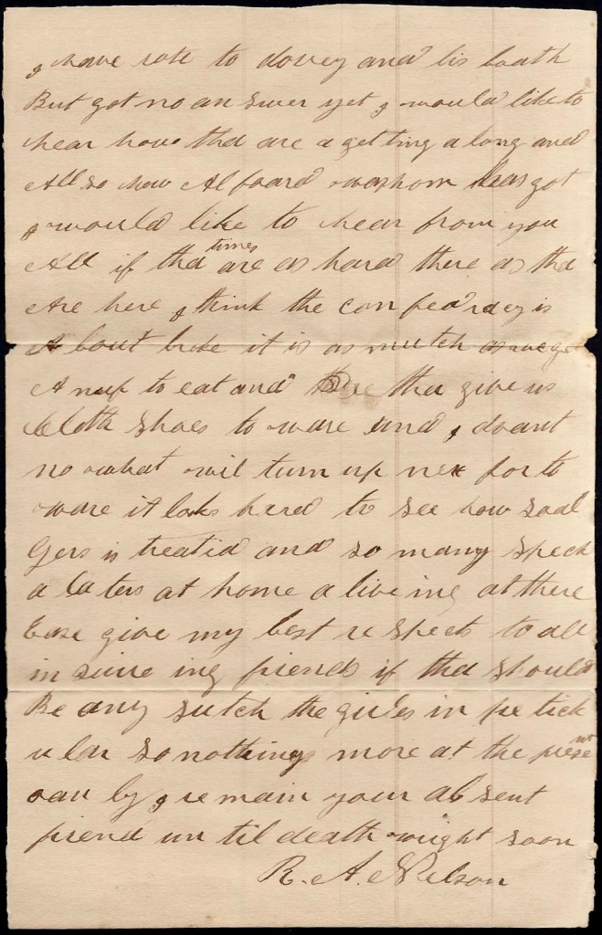 Give my best respects to all enquiring friends, if there should be any such—the girls in particular. So nothing more at the present. Only remain your absent friend until death. Write soon, — R. A. Nelson