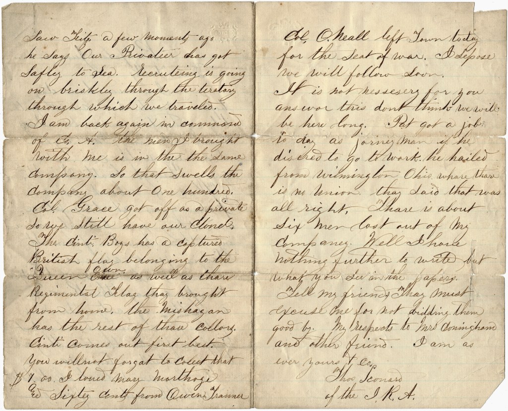 I am back again in Co. A. The men I brought with me is in the same company. So that swells the company about one hundred. Col. Grace got off as a private. So we still have our Colonel. The Cincinnati Boys has a captured British flag belonging to the Queen’s Own as well as their Regimental flag brought from home. The Michigan has the rest of their colors. Cincinnati comes out first best. You will not forget to collect that $7 I loaned Mary Martha. And sixty cents from Owen Tranner.