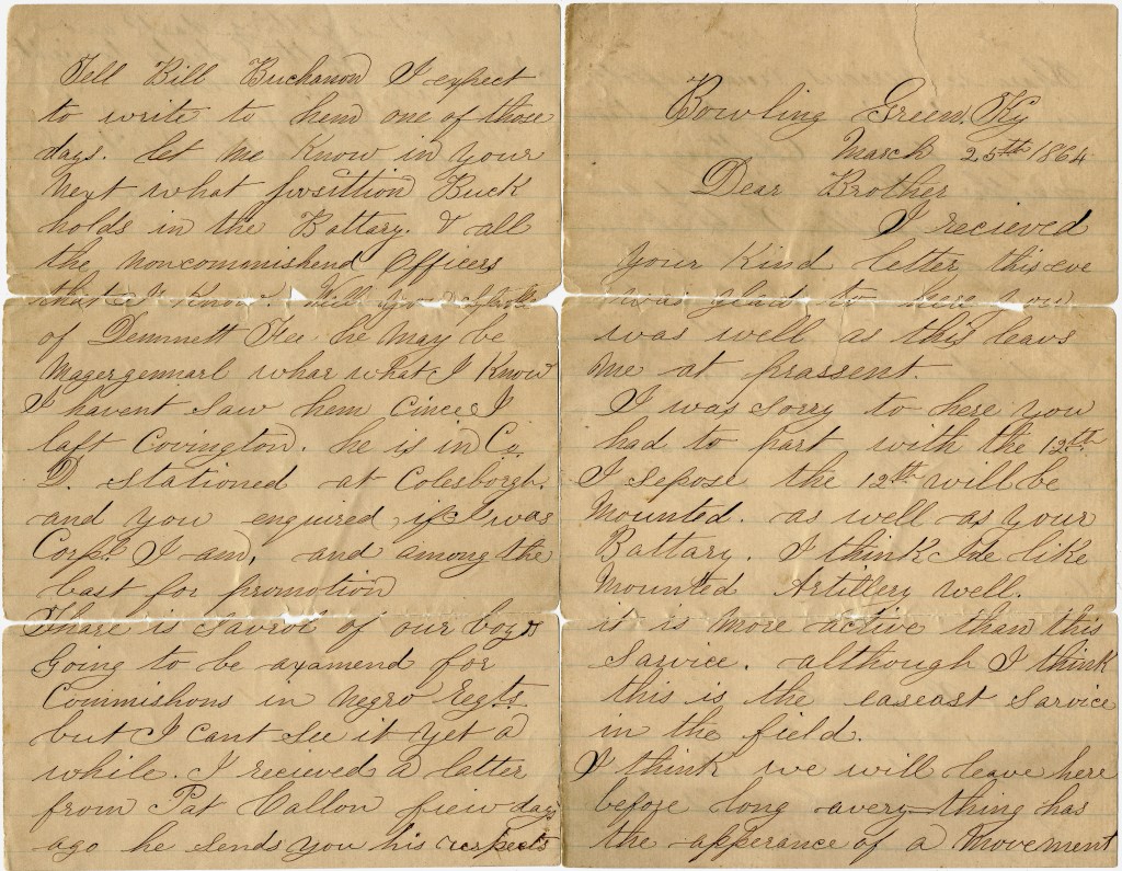 Tell Bill Buchanan I expect to write to him one of these days. Let me know in your next what position Buck holds in the Battery & all the non-commissioned officers that I know. Will [illegible] of Dimmett Fee. He may be Major General where what I know. I haven’t saw him since I left Covington. He is in Co. D stationed at Colesburgh and you enquired if I was corporal. I am and among the last for promotion.