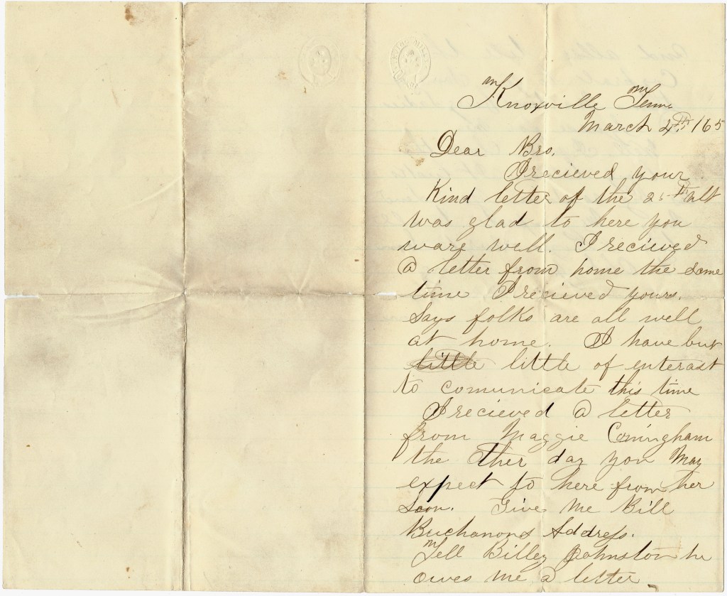 I received your kind letter of the 25th ultimo. Was glad to hear you was well. I received a letter from home the same time I received yours. Says folks are all well at home. I have but little of interest to communicate this time. I received a letter from Maggie Cunningham the other day. You may expect to hear from her soon. Give me Bill Buchanan’s address. Tell Billy Johnston he owes me a letter and also tell the corporal to give some of them Martinsburg [W. Virginia] Ladies a squeeze for me.