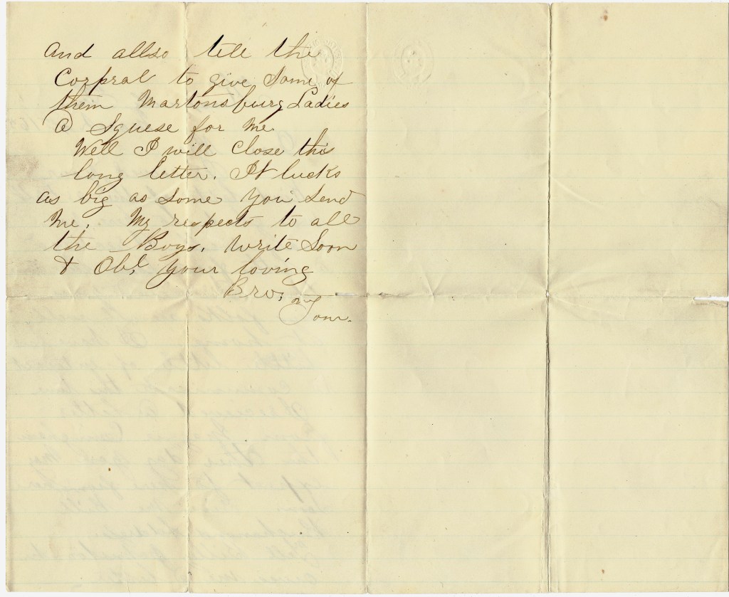 Well, I will close this long letter. It looks as big as some you send me. My respects to all the Boys. Write soon & oblige your loving brother, — Tom