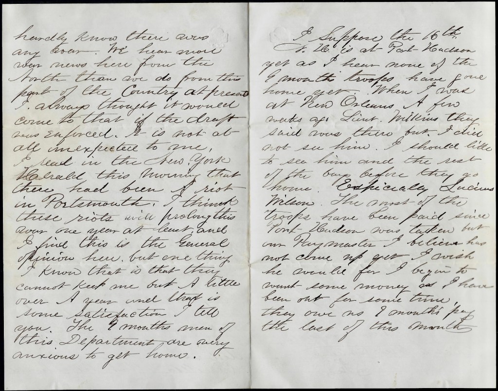I can say as Hillis Wilson died when he was at Carrollton that we should hardly know there was any war. We hear more war news here from the North than we do from this part of the country at present. I always thought it would come to that if the draft was enforced. It is not at all unexpected to me. I read in the New York Herald this morning that there had been a riot in Portsmouth. I think these riots will prolong this war one year at least, and I find this is the general opinion here. But one thing I know—that is that they cannot keep me but a little over a year and that is some satisfaction, I tell you. The 9-month’s men of this Department are very anxious to get home.