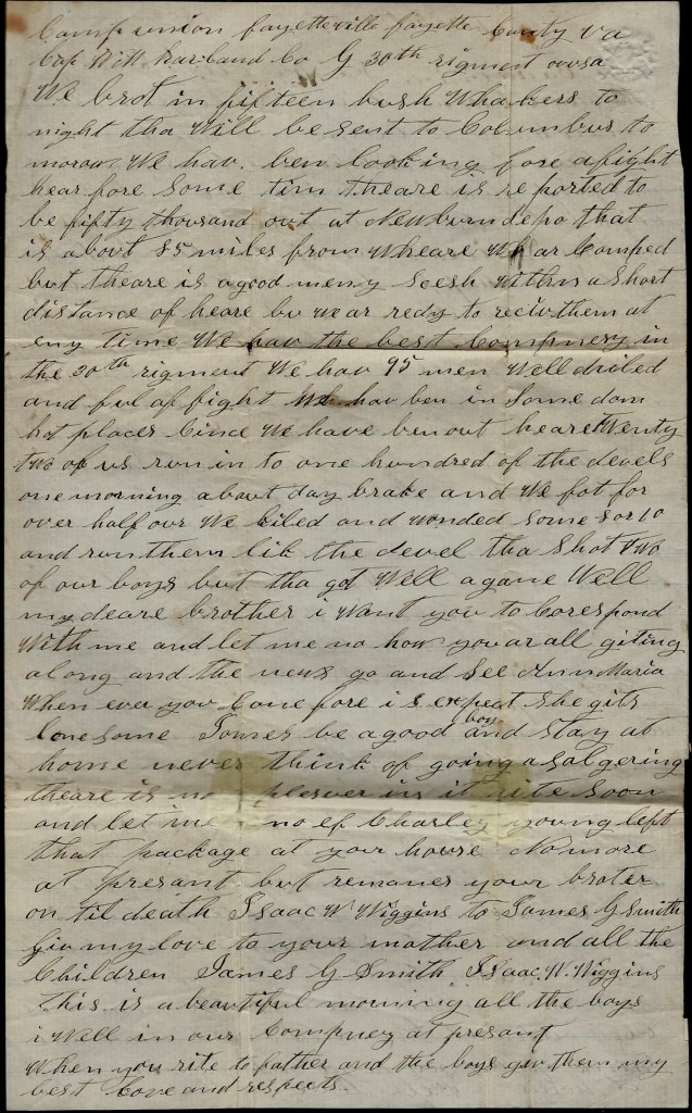 Well, dear brother, we brought in fifteen bushwhackers tonight. They will be sent to Columbus tomorrow. We have been looking for a fight here for some time. There is reported to be fifty thousand out at Newbern Depot—that is about 85 miles from where we are camped—but there is a good many secesh within a short distance of here. But we are ready to receive them at any time. We have the best company in the 30th Regiment. We have 95 men, well drilled, and full of fight. We have been in some damn hot places since we have been out here. Twenty-two of us run into one hundred of the devils one morning about daybreak and we fought for over half an hour. We killed and wounded some 8 or 10 and run them like the devil. They shot two of our boys but they got well again.