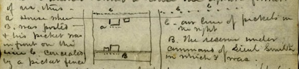 Obeying orders—a soldier’s stern duty—we with another company from our regiment proceeded two squares further in the advance and after being divided into the outer picket and reserve, commenced our night’s labor. Lieut. Burgess was in command of the outer picket and was stationed behind a house one square forward of us thus [sketch]