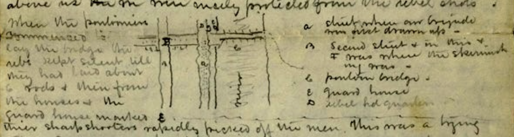 When the pontooniers commenced to lay the bridge, the rebs kept silent till they had laid about 6 rods & then from the houses & the guard house marked [on sketch], their sharpshooters rapidly picked off the men This was a trying time. Every man who stepped out to do anything was of course a mark. The 7th Michigan being at supporting distance was ordered to cross in boats. No one seemed willing to run the risk. Gen. Burnside addressed them saying he wanted the men to cross & appealed to their patriotism &c. (so report says) when they immediately volunteered to go. After taking a drink of whiskey, the boats pushed off and in a few minutes touched the other shore notwithstanding the rebel shots from this city. The first man who landed fell dead & some of the others were wounded but ashore the rest went & soon after others and a struggle for the mastery began which ended in our gaining the ground.