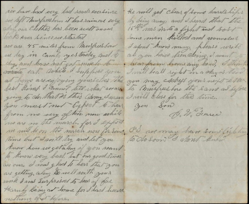 We have had very bad roads ever since we left Murfresboro. It has rained every day. Our clothes has been wet on our backs ever since we started. We are 45 miles from Murfreesboro. We lay in camp yesterday and today and have not much to eat, while I suppose you at home are enjoying yourselves the best kind. I cannot tell what we are going to do—that is, this army I mean. You must not expect to hear from me very often now while we are on the march for I expect we will be on the march now for some time. But I will try and let you know how we get along if you want to know very bad, but our good times are over.