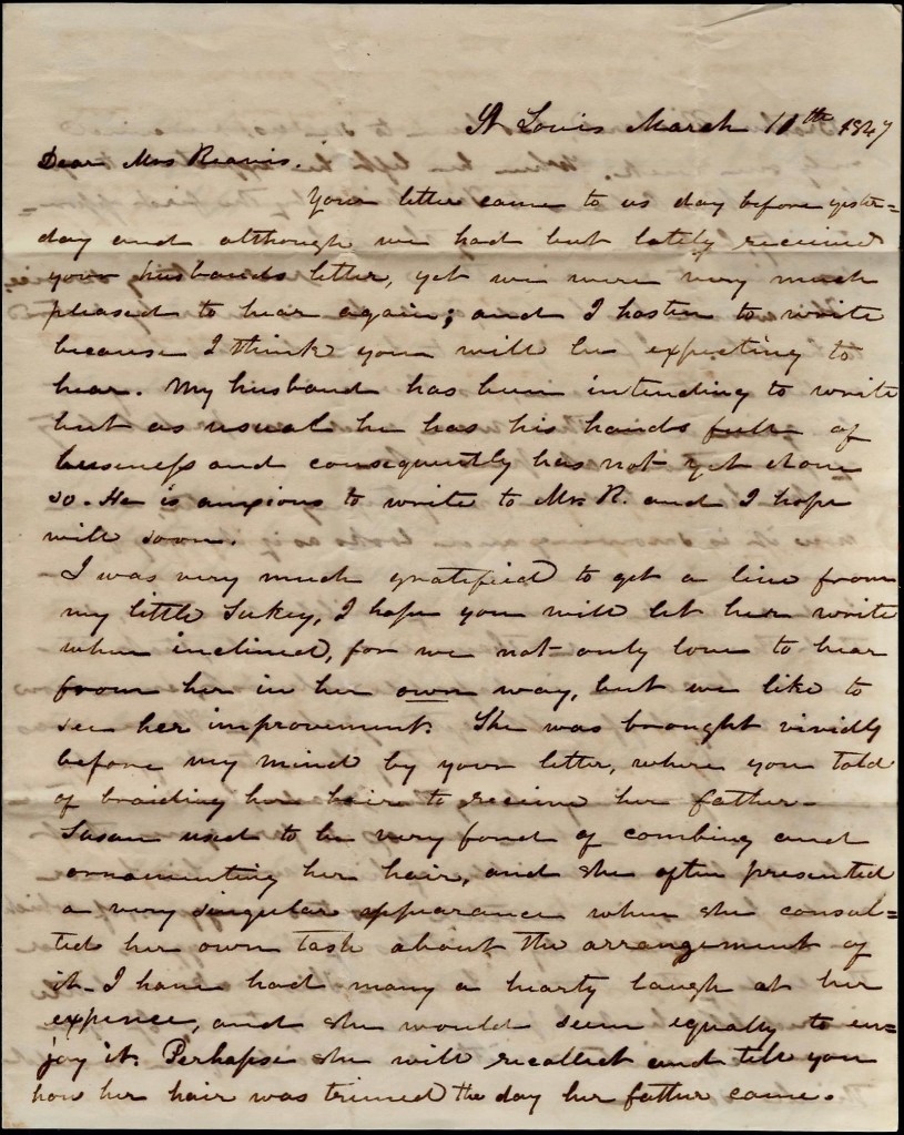 I was very much gratified to get a line from my little Sukey. I hope you will let her write when inclined for we not only love to hear from her in her own way, but we like to see her improvement. She was brought vividly before my mind by your letter, where you told of braiding her hair to receive her father. Susan used to be very fond of combing and ornamenting her hair, and she often presented a very singular appearance when she consulted her own task about the arrangement of it. I have had many a hearty laugh at her expense, and she would seem equally to enjoy it. Perhaps she will recollect and tell you how her hair was trimmed the day her father came.