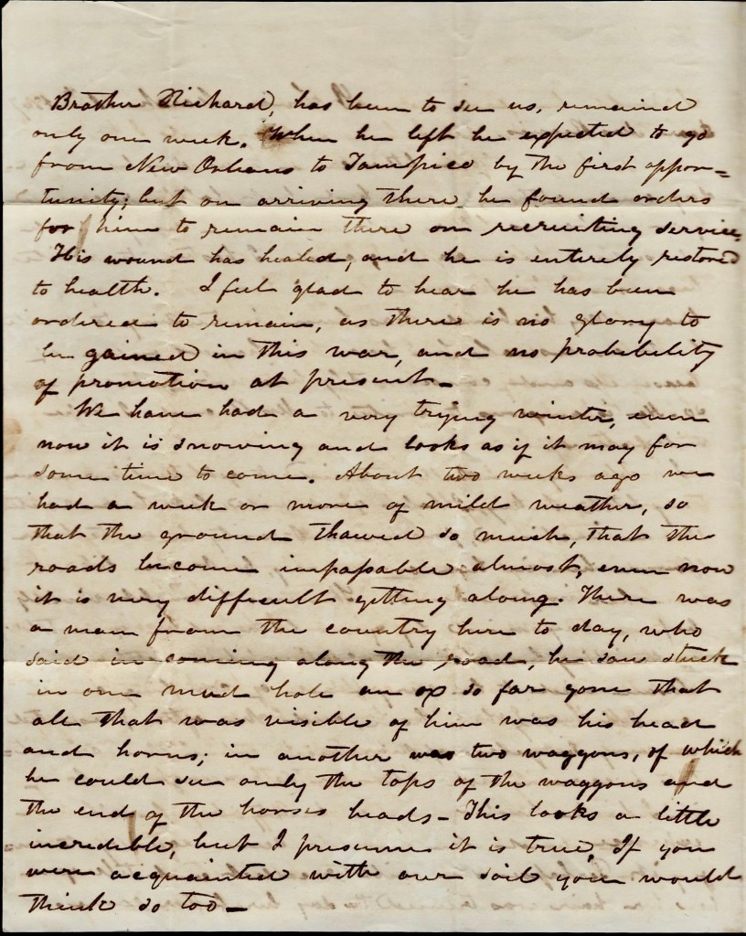 Brother Richard has been to see us, remained only one week. When he left he expected to go from New Orleans to Tampico by the first opportunity; but on arriving there he found orders for him to remain there on recruiting service. His wound has healed and he is entirely restored to health. I feel glad to hear he has been ordered to remain as there is no glory to be gained in this war and no probability of promotion at present