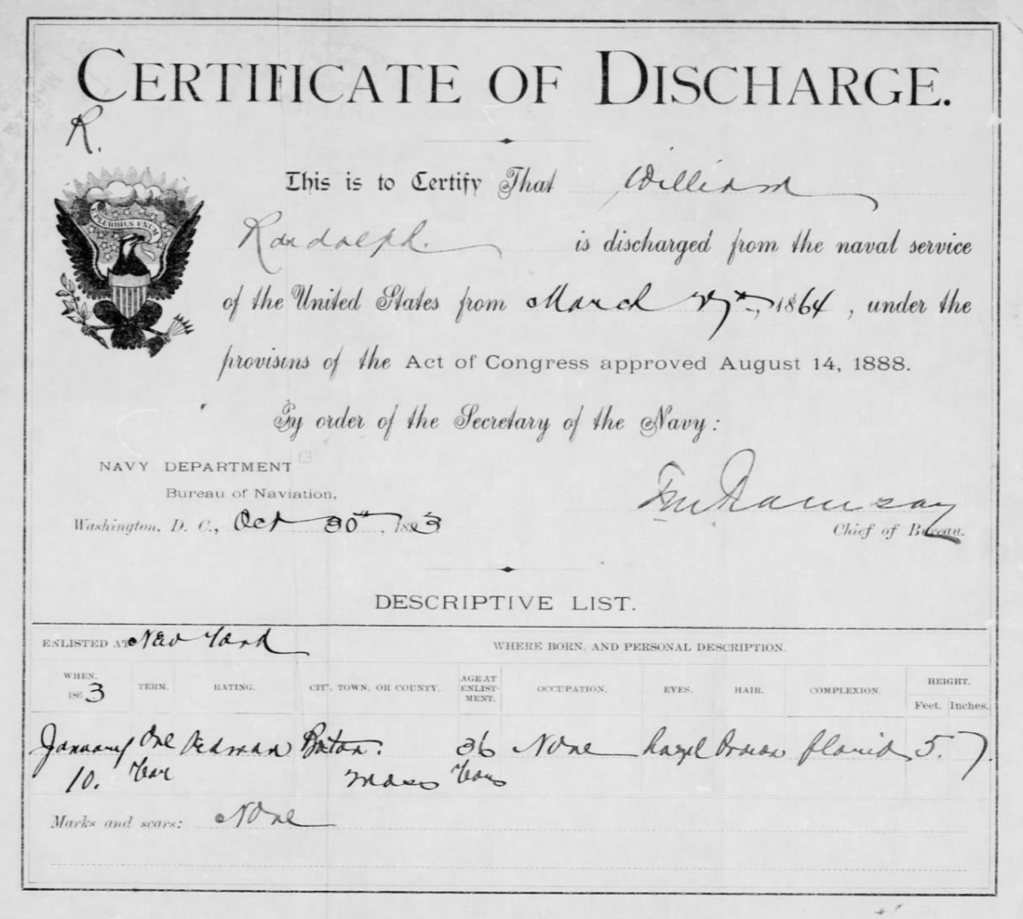In his letter, 99 year-old Munroe, nearly blind from cataracts after years spent at sea, chronicles his service record in the U. S. Navy beginning with his initial enlistment under the name of William Randolph which he explains was done because he substituted for a man by that name who “was not much of a sailor.” Munroe’s pension file includes discharge certificates for both Randolph and Munroe. See footnotes.
