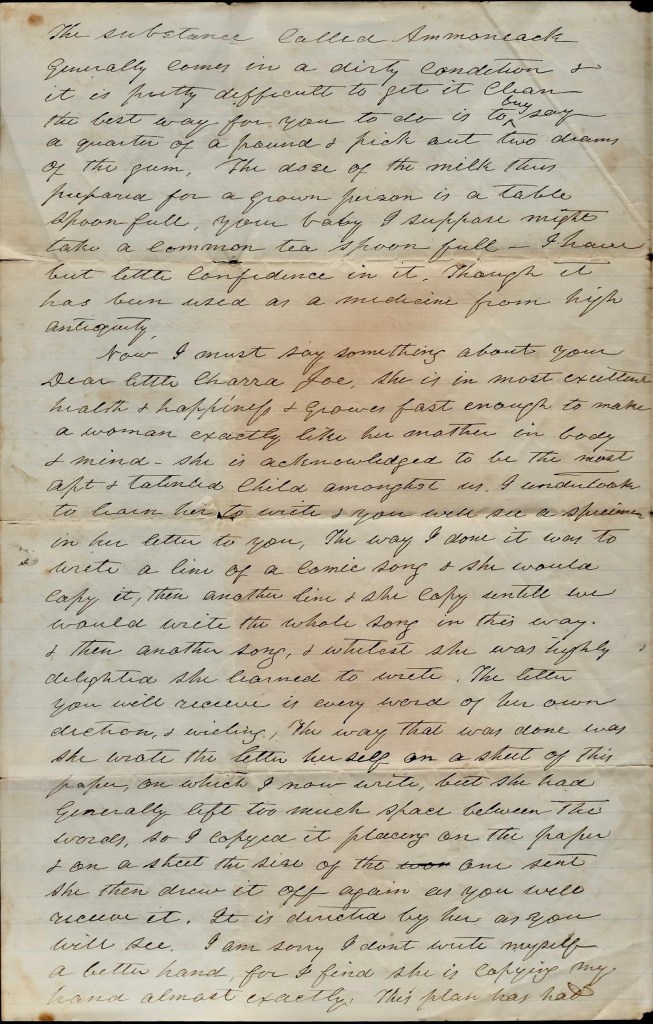Now I must say something about your dear little Charra Joe. She is in most excellent health and happiness & grows fast enough to make a woman exactly like her mother in body & mind. She is acknowledged to be the most apt & talented child amongst us. I undertook to learn her to write & you will see a specimen in her letter to you. The way I done it was to write a line of a comic song & she would copy it, then another line, and she copy until we would write the whole song in this way. And then another song, and whilst she was highly delighted she learned to write. The letter you will receive is every word of her own diction, and writing. The way that was done was she wrote the letter herself on a sheet of this paper on which I now write, but she had generally left too much space between the words, so I copied it placing it on the paper & on a sheet the size of the one sent. She then drew it off again as you will receive it. It is directed by her as you will see. I am sorry I don’t write myself a better hand, for I find she is copying my hand almost exactly. This plan has had the advantage of learning her to read writing which she does with very considerable facility. She reads print remarkably well. I often get her to read pieces in the newspaper for me in the dim of the evening when I cannot well see, and she does it very satisfactorily. She is growing, I think, very handsome. The skin is smooth and her countenance very radiant, particularly when she is in a good humor which is her wont.
