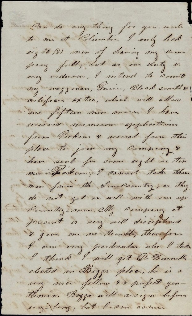 I only last eight (8) men of having my company full; but as our duty is very arduous, I intend to count my wagoner, farrier, blacksmith, and artificer, &c. which will allow me fifteen men more. I have received numerous application from Pickens and several from this place to join my company & have sent for some eight or ten men in Pickens. I cannot take these men from the Low-country as they do not get on well with our Up-country men. My company at present is very well disciplined & give me no trouble. Therefore, I am very particular who I take. I think I will get Dr. Bennett elected in Boggs place. He is a very nice fellow & a perfect gentleman. Boggs will resign before very long but I can assure you it is not from sickness. It is from pure cowardice. He is the most errant coward I ever saw.