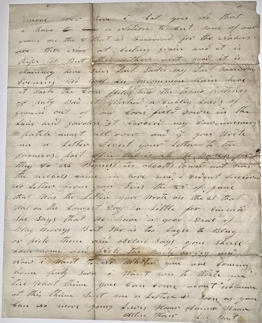 I let you know that I have a notion to cut some of our grain on the 8th, that is tomorrow, for the neighbors are still none at cutting grain and it is ripe too, but the weather ain’t good. It is raining here since last Saturday. Last Saturday evening we had an uncommon rain here. It wash the cornfields and the tobacco patches off pretty bad. It washed a couple loads of grain out of our corn field down in the lane and garden. It covered my [ ] patch most all over and if you write me a letter, direct your letter to the farmers post office that is at the [ ] for they do no business in Abbottstown—not since the rebels came in here, and I didn’t receive no letter from you since the 25th of June. That was the letter you wrote on the 21st. That was the longest day.