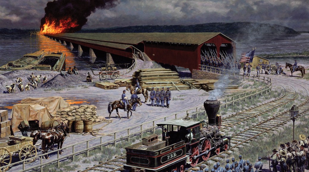 “When Confederate Brigadier General John Brown Gordon arrived on June 28 with approximately 1,800 troops, the Federals were waiting in their entrenchments. The Rebels opened up with artillery fire, and the Union position rapidly became untenable. The Federals decided to retreat to Columbia and blow up a section of the over mile-long bridge behind them, denying the Rebels access to Lancaster. The explosion failed to destroy the bridge, so the order to burn it was given. As the Confederates surged forward, the bridge erupted in flames. Gordon’s men worked for hours to extinguish the blaze. They kept Wrightsville from going up in smoke, but the bridge, financed by the First National Bank of Columbia, was destroyed. Gordon’s brigade was recalled to York the next day.“