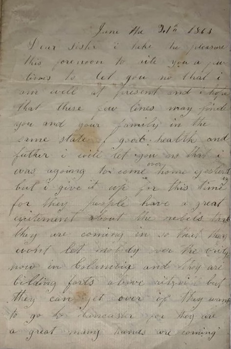 I take the pleasure this forenoon to write you a few lines to let you know that I am well at present and I hope that these few lines may find you and your family in the same state of good health and further, I will let you know that I was a going to come over home yesterday but I gave it up for this time for the people have a great excitement about the rebels that they are coming in so that they won’t let anybody over the bridge now in Columbia and they building forts above [the] city. But they can get over if they want to go to Lancaster for they are a great many hands are coming over to work in haymaking and harvesting and they never said a word to them that they can’t get over. But if one of our men wants to cross the bridge, they can’t.