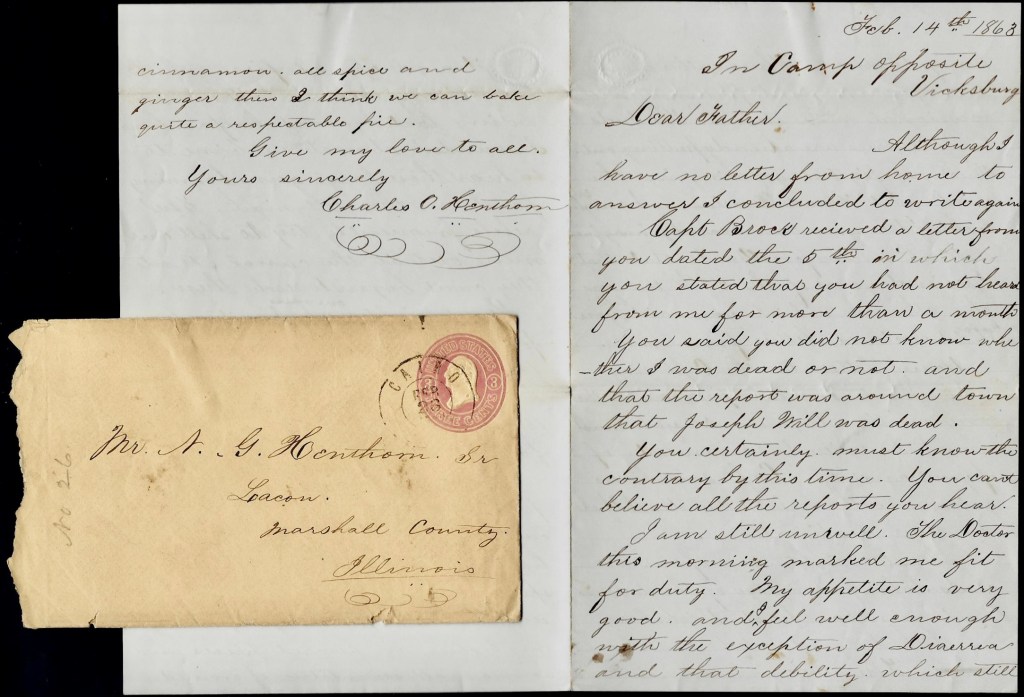Charles enlisted in Co. D, 77th Illinois Infantry during the Civil War. Many of his letters are housed in the William L. Clements Library at the University of Michigan. Charles is described in that collection as “an unusually powerful writer and provides thoughtful, evocative descriptions of the events unfolding around him. His observations on the varied roles of African Americans in the army are particularly noteworthy. They are depicted in several ways: as informers on Confederate sympathizers hiding from the Union Army, as victims of racism and southern hatred, and as highly motivated and effective soldiers at the Battle of Milliken’s Bend. Henthorn appears to have a much more positive attitude toward blacks than many of his fellow soldiers, and he appears equally to be aware of this fact. Equally interesting are Henthorn’s descriptions of the land itself, including fine descriptions of towns in Indiana and Ohio, and of evacuated plantations in Louisiana. He makes several references to hostile southern attitudes toward the Union troops, and describes an instance of pillaging by members of his regiment. There are two second-hand accounts of battles, the Battles of Richmond and Milliken’s Bend, but by and large, there is very little martial content in Henthorn’s letters. He is instead at his best in his reflections on the effect of the conflict on the soldiers and civilians. The final two letters in the collection provide (respectively) an insight into the depth of Henthorn’s religiously held pro-Union, anti-slavery views, and an account of a copperhead rally in Lacon during the 1864 presidential election which featured a coffin containing a likeness of Lincoln with buzzards flying overhead…Like many soldiers in his regiment, Henthorn was striken with illness during the Vicksburg Campaign, and spent seven weeks in the Van Buren Hospital at Milliken’s Bend, La., before being sent to St. Louis for convalescence. This series of correspondence essentially ends when Henthorn leaves the south, however the regimental history for the 77th Illinois records Henthorn as mustering out only at the end of the war.”