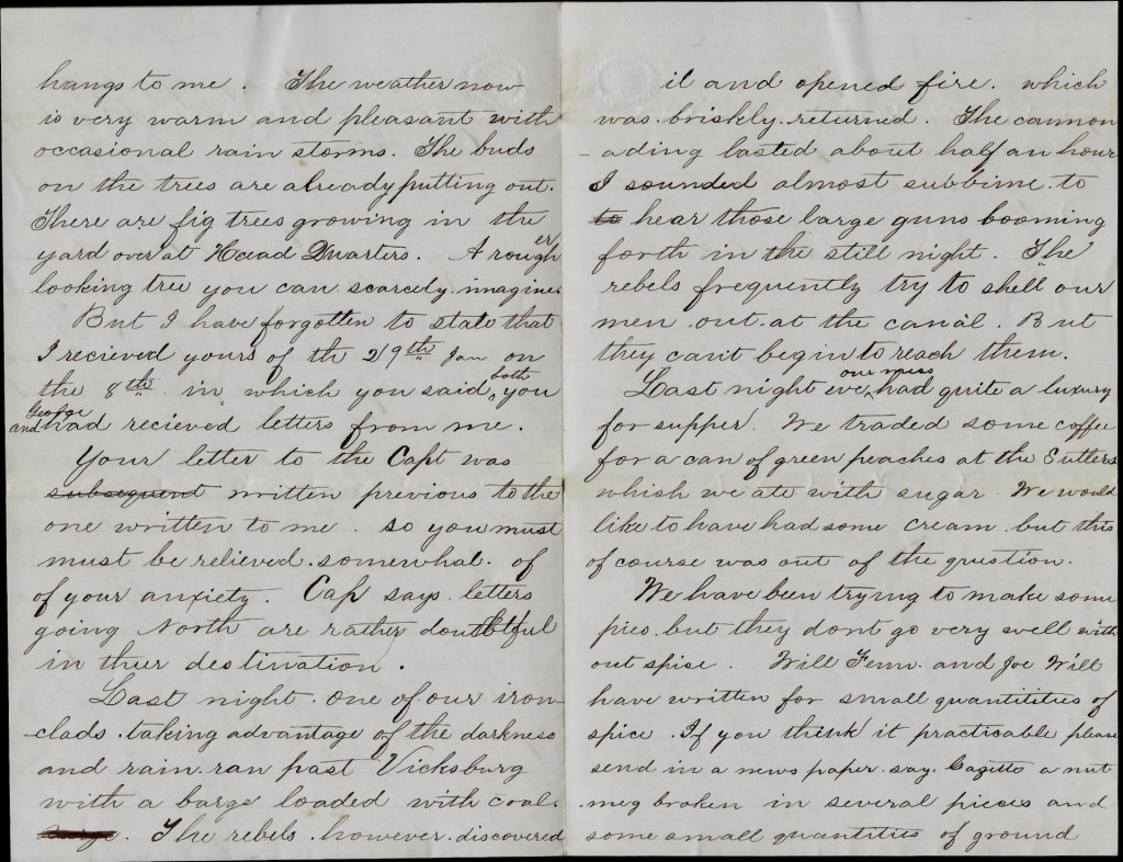 Last night one of our ironclads 1 taking advantage of the darkness and ran ran past Vicksburg with a barge laded with coal. The rebels, however, discovered it and opened fire which was briskly returned. The cannonading lasted about half an hour. It sounded almost sublime to hear those large guns booming forth in the still night. The rebels frequently try to shell our men out at the canal but they can’t begin to reach them.