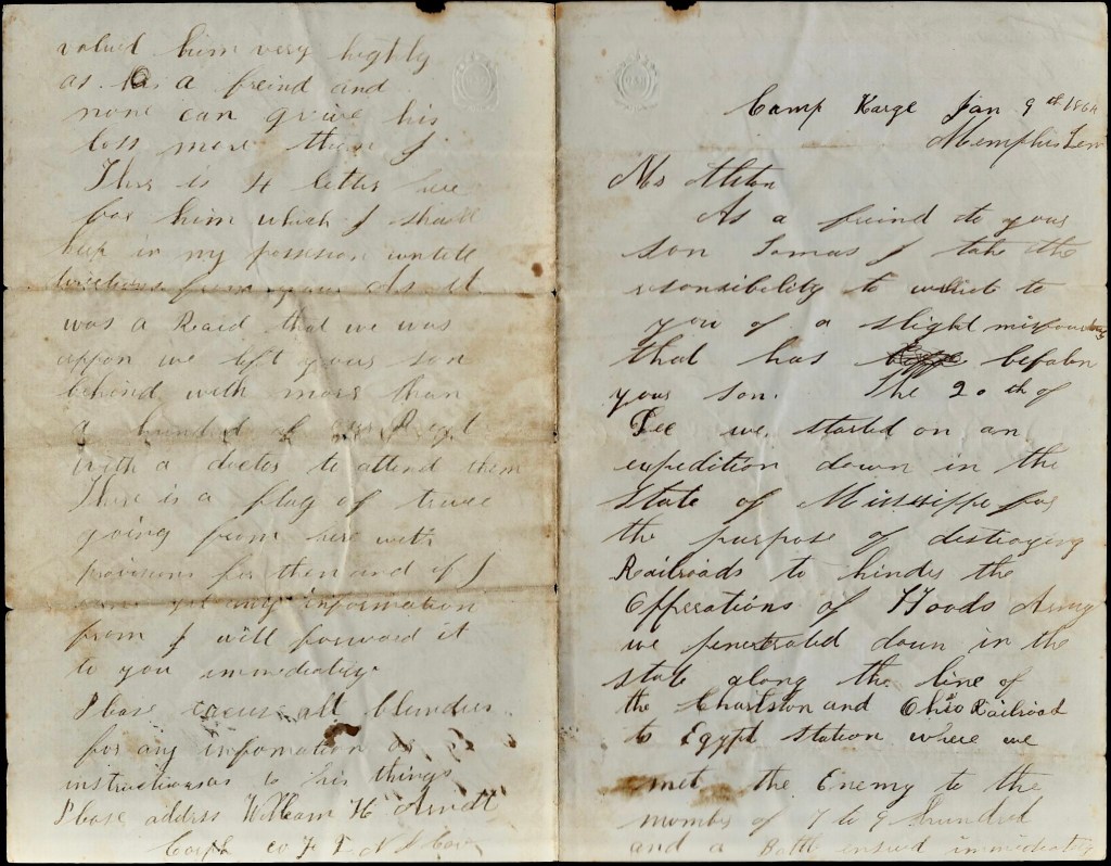 As a friend to your son Thomas I take the responsibility to write to you of a slight misfortunate that has befallen your son. The 20th of December we started on an expedition down in the State of Mississippi for the purpose of destroying railroads to hinder the operations of Hood’s army. We penetrated sown in the state along the line of the Charleston and Ohio Railroad to Egypt Station where we met the enemy to the number of 7 to 9 hundred and a battle ensued immediately.