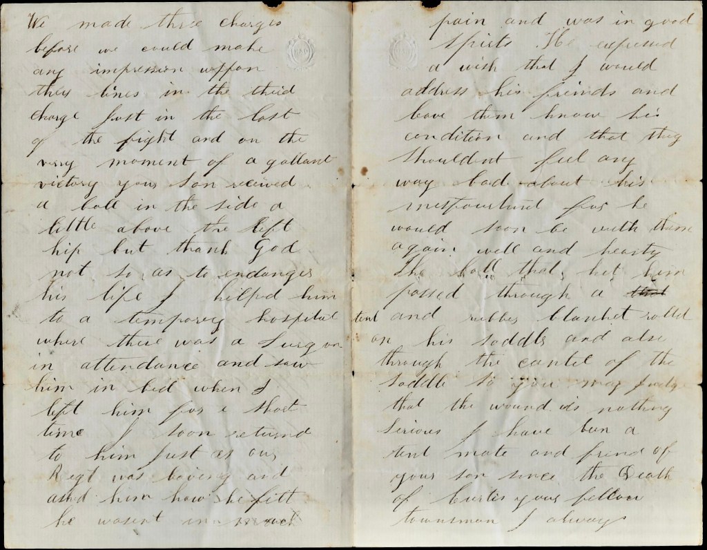 We made three charges before we could make any impression upon their lines. In the third charge, just in the last of the fight and on the very moment of a gallant victory, your son received a ball in the side a little above the left hip, but thank God not so as to endanger his life. I helped him to a temporary hospital where there was a surgeon in attendance and saw him in bed when UI left him for a short time. I soon returned to him just as our regiment was leaving and asked him how he felt. He wasn’t in much pain and was in good spirits. He expressed a wish that I would address his friends and leave them know his condition and that they shouldn’t feel anyway bad about his misfortune for he would soon be with them again, well and hearty.