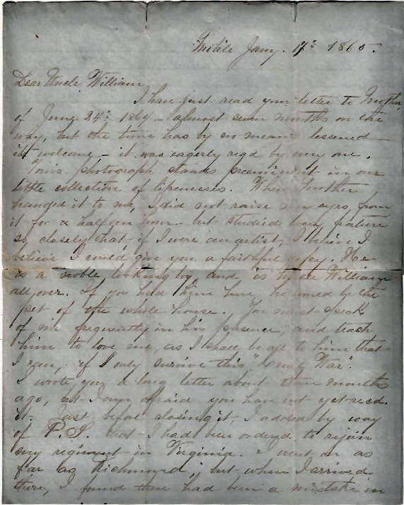 Tom’s 1 photograph stands preeminent in our little collection of likenesses. When Mother handed it to me, I did not raise my eyes from it for half an hour, but studied every feature so closely that if I were an artist, I believe I could give you a faithful copy. He is a noble looking boy and is Uncle William all over. If you had him here, he would be the pet of the whole house. You must speak of me frequently in his presence, and teach him to love me, as I shall be all to him that I can, if I only survive this “Cruel War.”