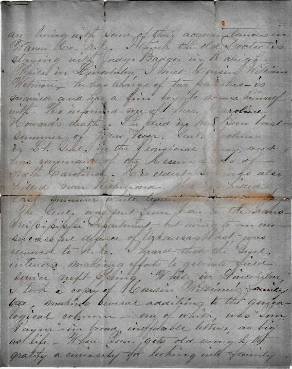 While in Lincolnton, I took a copy of Cousin William [Wetmore]’s family tree, making several additions to the genealogical column, one of which was “Tom Payne” [Ward] in broad, ineffaceable letters, as big as life. When Tom gets old enough to gratify a curiosity for looking into family bibles and family records, he may possibly stumble across this, and I know he will thank me for handing his name down to posterity.