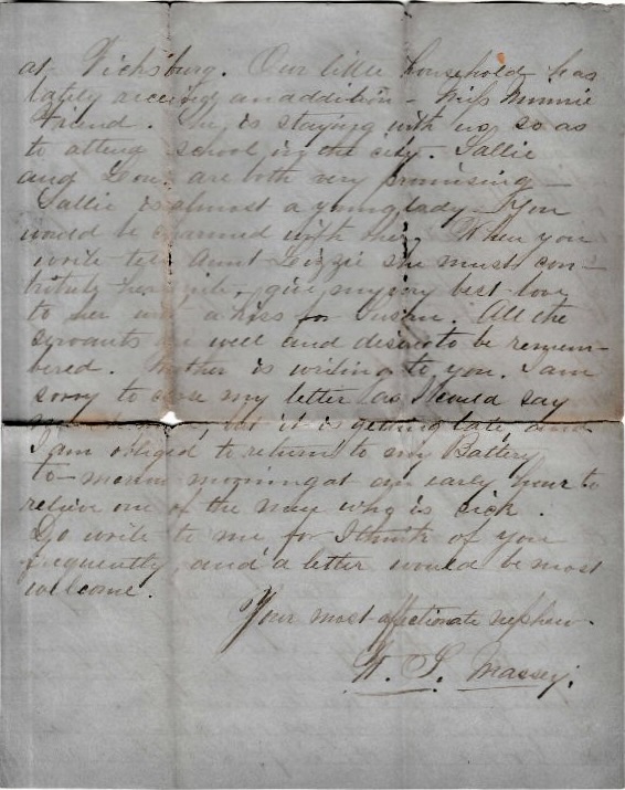 I see Mr. [John Julius] Delchamps occasionally. He is coroner for the city. He lost a son at Vicksburg. 7 Our little household has lately received an addition—Miss Minnie Friend. She is staying with us so as to attend school in the city. Sallie and Lou. are both very promising. Sallie is almost a young lady. You would be charmed with her. When you write, tell Aunt Lizzie she must contribute her mite. Give my best love to her with a kiss for Susan. All the servants are well and desire to be remembered. Mother is writing to you. I am sorry to close my letter as I could say [paper torn], but it is getting late and I am obliged to return to my Battery tomorrow morning at an early hour to relieve one of the men who is sick. Do write to me for I think of you frequently and a letter would be most welcome.