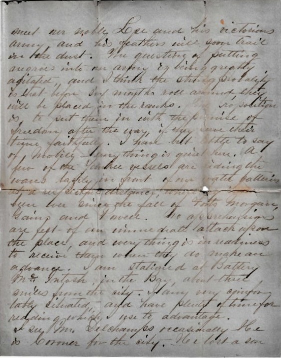 Before this reaches you, you may have heard of reverses to our armies in Georgia but do not let it dishearten you. Sherman has been a successful leader for the Yankees, and is supposed to be making his way gradually to Richmond, but there he will meet our noble Lee and his victorious army, and his feathers will soon trail in the dust. The question of putting negroes into our army is being greatly agitated, and I think the strong probability is that before six months roll around, they will be placed in the ranks. The proposition is to put them in with the promise of freedom after the war, if they serve their time faithfully.