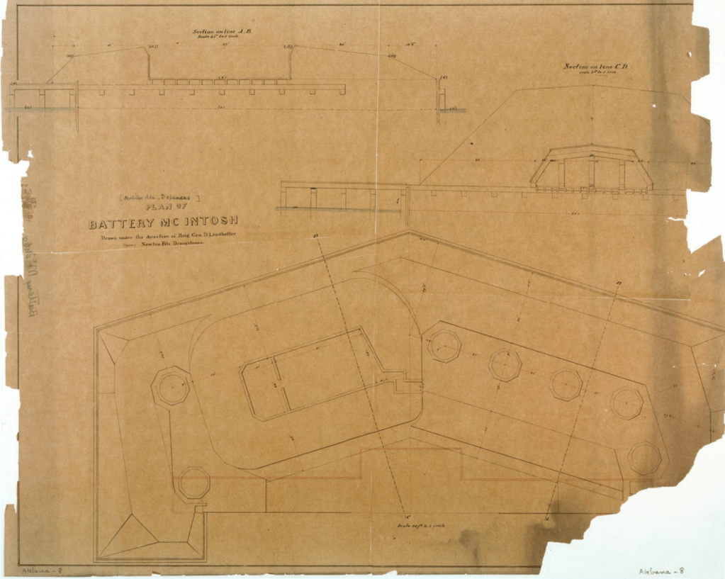 6 What remains of Battery McIntosh lies southeast of the USS Alabama at the north end of Mobile Bay. Battery McIntosh was meant to be a defensive battery, a small fort, to protect the Tensaw River and the City of Mobile during the American Civil War.