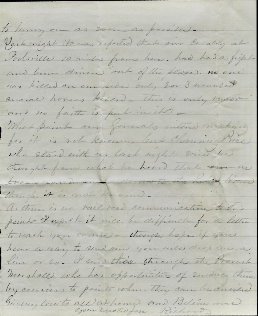 Last night it was reported that our cavalry at Poolesville, 10 miles from here, had a fight and been driven out of the place. No one was killed on our side—only 2 or 3 wounded [and] several horses killed. This is only rumor and no faith is put in it. What point our Generals intend making for, it is not known, but Channing Price, 2 who staid with us last night, said he thought from what he heard that we would move down to the Relay House, though it is not known. As there is no railroad communication to this point, I expect it will be difficult for a letter to reach you or me, though hope if you have a way to send one you will drop me a line or so. I send this through the Provost Marshal who has opportunities of sending them by couriers to points where they can be delivered. Give my love to all at home, and believe me, your devoted son, — Richard