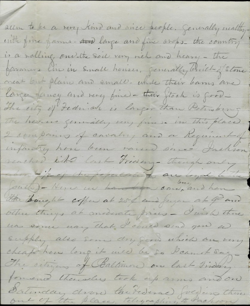 The city of Frederick is larger than Petersburg, the houses generally very fine. In this place two companies of cavalry and a regiment of infantry have been raised since [General] Jackson reached it last Friday, though only about half of the population are loyal to the South. Here we can buy—and have bought—coffee at 25 cents, sugar at 90, and other things at moderate prices. I wish there was some way that I could send you a supply, also some dry goods which are very cheap. How long it will be so, I cannot say. The citizens of Baltimore on last Friday formed themselves, took up arms, and on Saturday drove the Federal soldiers there out of the place, telegraphing to [General] Jackson to hurry on as soon as possible.
