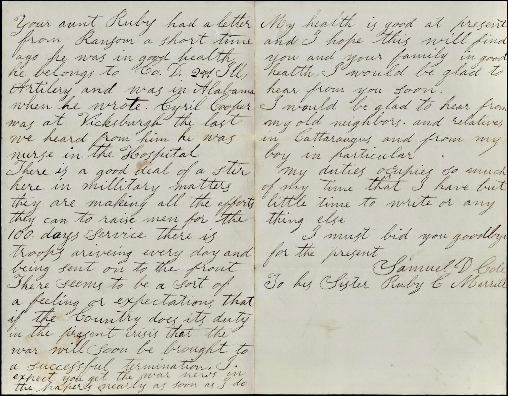 Your Aunt Ruby had a letter from Ransom a short time ago. He was in good health. He belongs to Co. D, 2nd Illinois Artillery and was in Alabama when he wrote. Cyril Cooper was at Vicksburg the last we heard from him. He was nurse in the hospital.