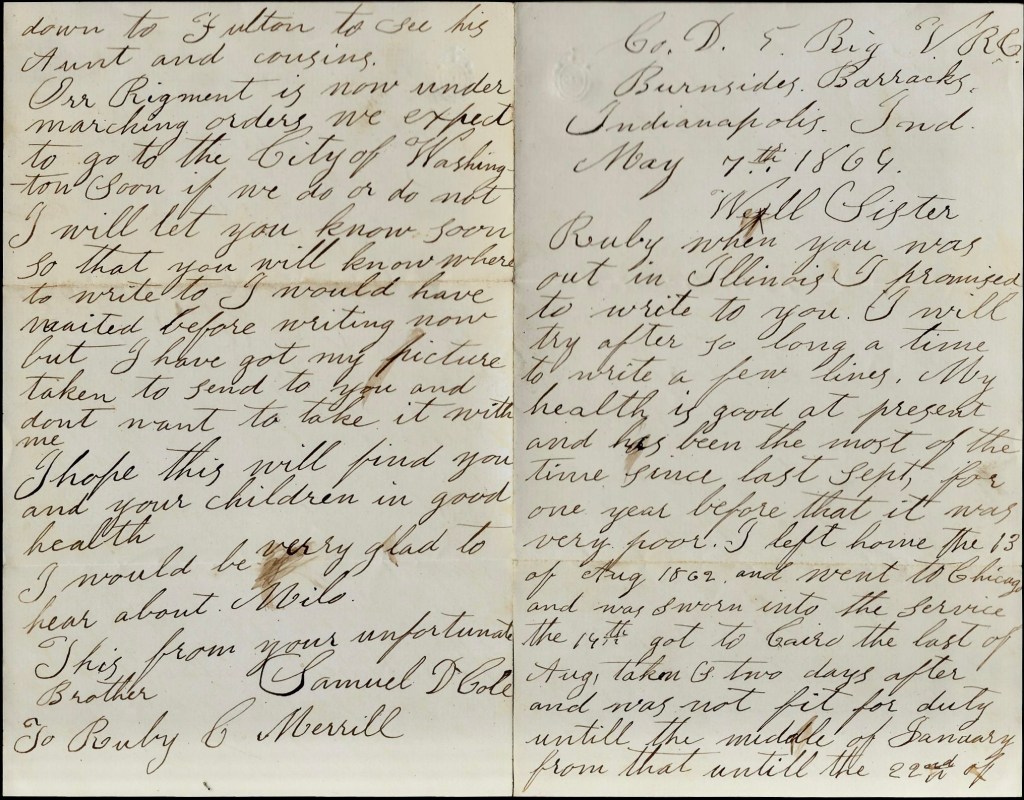 The following letters were written by Samuel Dill Cole (1819-1903), who enlisted as a private in Co. I, 72nd Illinois Infantry in mid-August 1862. At the time of his enlistment, Samuel was described as a 5’7″ tall, brown-haired, married, 44 year-old farmer residing in Prairie City, McDonough county, Illinois. When he wrote these letters in 1864, Samuel was in the Fifth Veteran Reserve Corps (VRC), having been transferred in August 1863 after only one year of service in the 72nd. We learn from these letters that Samuel had been wounded in his right arm on 22 May 1863 in the fighting before Vicksburg. The Fifth VRC was garrisoned in Burnside’s Barracks in Indianapolis where their regular duty was to guard Confederate prisoners in nearby Camp Morton.
