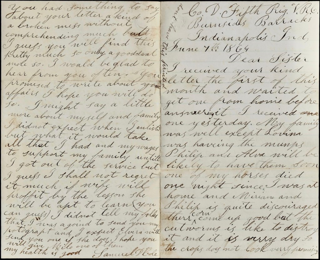 My family was well except Lovina was having the mumps. Philip and Alva will be likely to have them soon. One of my horses died one night since I was at home and Miriam and Philip is quite discouraged. They corn come up good but the cut worms is like to destroy it and it is very dry. The crops does not look very promising so you may guess they have some cause to be somewhat discouraged. Last year it was extremely dry in parts of Illinois and some of my old neighbors said that there had never been so near a total failure of crops as there was last year. My family had to buy everything to live on except bread. I raised wheat enough before I enlisted to last them until after harvest but I guess there will be some way for them to get along. I have sent home $180 since I have been in the service and I guess they have nearly enough to buy a horse on hand now.