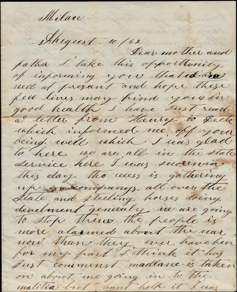 We are all in the [Missouri] State [Militia]Service here. I was sworn in this day. The secesh is gathering up in companies all over the state and stealing horses, doing devilment generally. We are going to stop them. The people is more alarmed about the war now than they ever have been. For my part, I think it has just commenced. Madlane is taking on about me going into the militia, but can’t help it. I was bound to go. They say we can stay at home the most of the time.