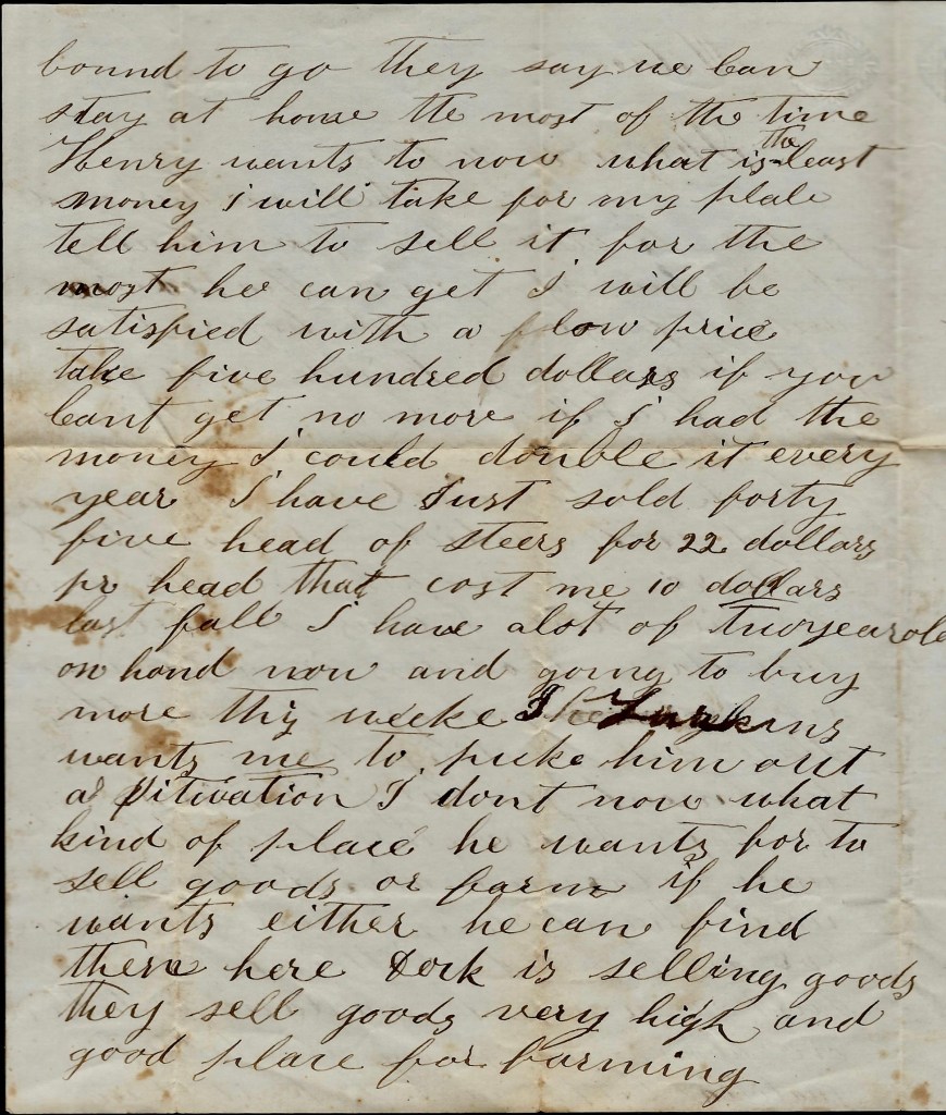 Henry wants to know what is the least money I will take for my place. Tell him to sell it for the most he can get. I will be satisfied with a low price. Take five hundred if you can’t get no more. If I had the money, I could double it every year. I have just sold forty-five head of steers for $22 per head that cost me $10 last fall. I have a lot of two-year-olds on hand now and going to buy more this week. I. Larkins wants me to pick him out a situation. I don’t know what kind of place he wants— for to sell goods, or [to] farm. If he wants either, he can find them here. Pork is selling good. They sell goods very high, and [it’s a] good place for farming.