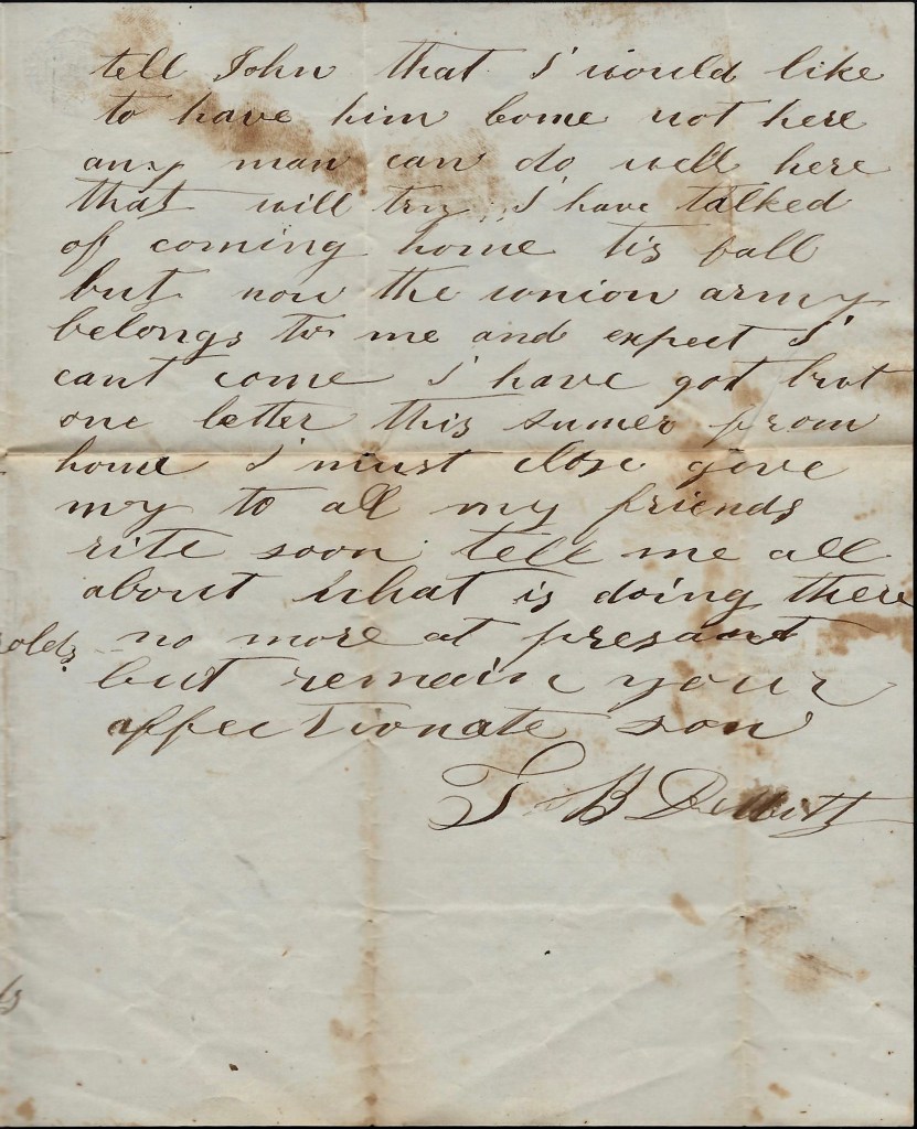 Tell John that I would like to have him come out here. Any man can do well here that will try. I have talked of coming home this fall but now the Union Army belongs to me and I expect I can’t come home. I have got but one letter this summer from home. I must close. Give my [respects] to all my friends. Write soon. Tell me all about what is doing there. No more at present, but remain your affectionate son, T. B. DeWitt