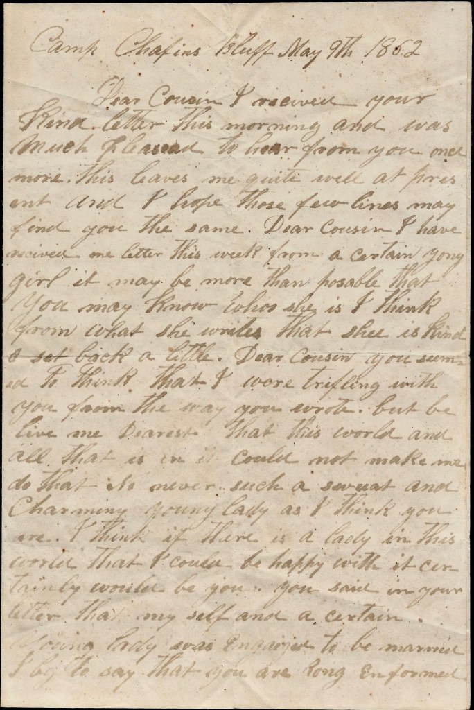 Dear cousin, as I am now writing, me thinks that I can see your sweet angelic form before my eyes and oh for the world that it was so. Oh! how much happiness I would feel than I do at this lonely hour. But I am glad to think that there is something to cheer a poor soldier up for a soldier’s life is a bad one. Make the best of it you can, dear cousin.