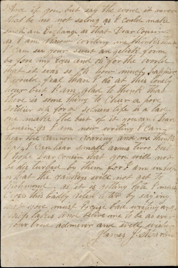 As I am now writing, I can hear the cannon roaring and me thinks that I can hear small arms too but I hope, dear cousin, that you will not be disturbed by them for I am in hopes that the Yankees will not get to Richmond. As it is getting late, I must close this badly written letter by saying that you must excuse bad writing and mistakes. And believe me to be as ever your true admirer and well wisher, — James J. Martin