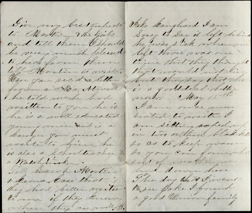 Tell Sarah Martin & Leona Case that they had better write to me if they know when they are well off. Jake Langhart, I am sorry to say, is left behind. He was sick when we left. There was one time that they thought he would not live but they say that he is a good deal better now. 1