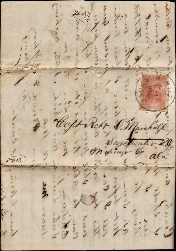Thomas wrote the letter to his uncle, Robert D. Marshall (1808-Aft1880), a native of Virginia, who was a merchant in Sweetwater, Marengo county, Alabama. He was married to Susan Daniels (1802-1855). By 1880 Robert had relocated to Kaufman county, Texas.