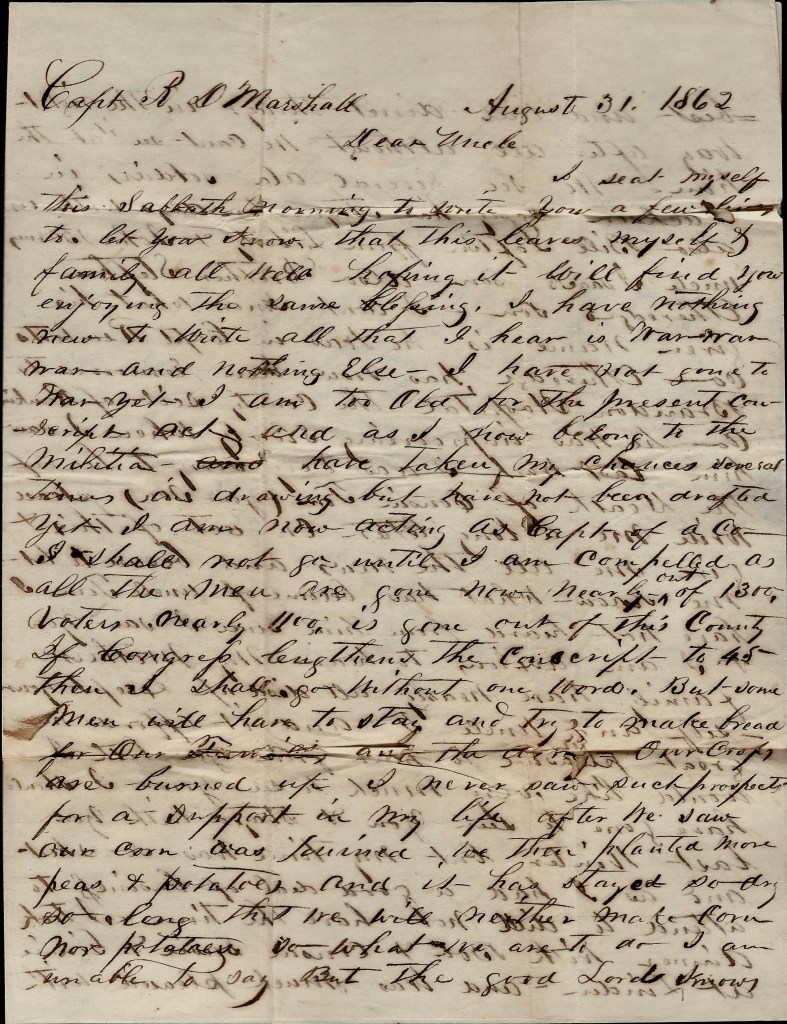 Dear uncle, I seat myself this Sabbath morning to write you a few lines to let you know that this leaves myself & family all well, hoping it will find you enjoying the same blessing. I have nothing new to write. All that I hear is war—war—war, and nothing else. I have not gone to war yet. I am too old for the present Conscript Act and as I now belong to the militia, have taken my chances several times in drawing, but have not been drafted yet. I am now acting as captain of a company. I shall not go until I am compelled as all the men are gone now nearly. Out of 1300 voters, nearly 1100 is gone out of this county.