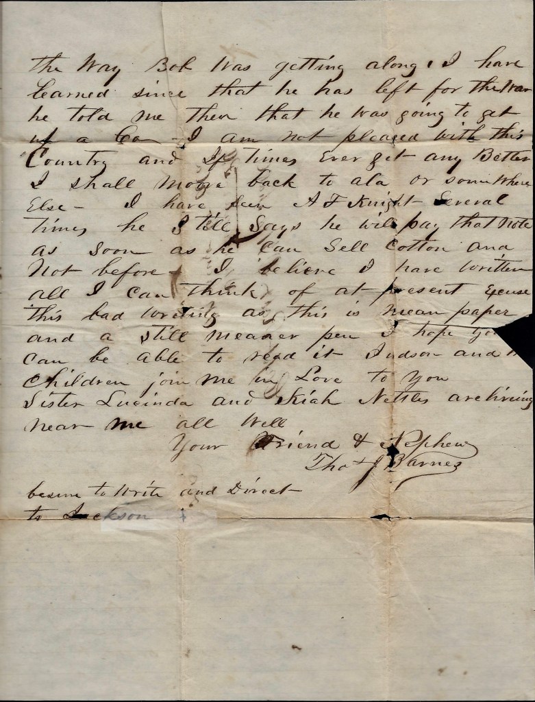 I am not pleased with this country and if times ever get any better, I shall move back to Alabama or somewhere else. I have seen A. F. Knight several times, He still says he will pay that note as soon as he can sell cotton and not before. I believe I have written all I can think of at present. Excuse this bad writing as this is mean paper and a still meaner pen. I hope you can be able to read it. Judson and his children join me in love to you. Sister Lucinda and Kiah Nettles are living near me. All well.