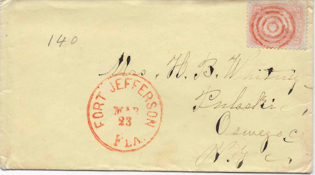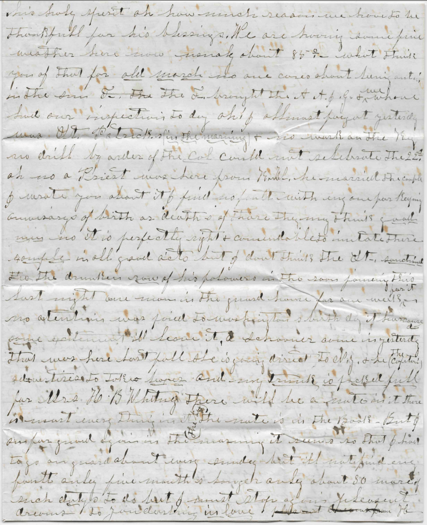We are having some fine weather here now—usually about 85 degrees. What think you of that for old March? No one cares about being outside in the sun. The F. brought the A. A. J. G. & we have had our inspections today. Oh! I almost forgot. Yesterday was St. Patrick’s 9in the morning) and no work on the Key. No drill by order of the Colonel. Could not celebrate the 22nd. Oh no. A Priest was here from Key West. He married the couple—I wrote you about it. I find no fault with anyone for keeping anniversaries of birth or deaths of those they may think good men. No, it is perfectly right & commendable to imitate their example in all good acts. But I don’t think the Saint sanctioned the drunken row of his followers in the room joining his last night. One man in the guard house for one week for it. No attention was paid to Washington’s Birthday. It has caused some excitement. I’ll leave it.