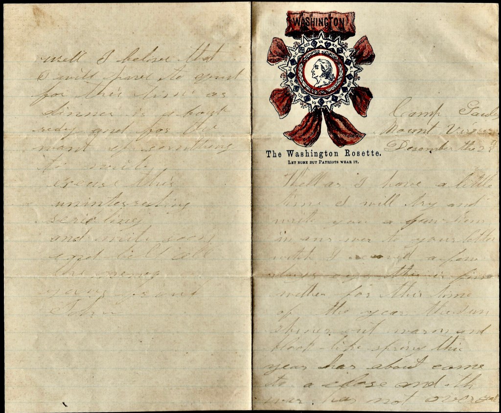 I suppose that you have good times on Christmas and New Years. Well, I will tell you how that we spent Christmas. There was some Gray Backs came into camp and said that there were some secesh that had come home on furlough and our company went out to see if they could find them. We went out past Hawk’s Nest and Lover’s Leap and Mountain Cave, and came back without finding any of them and that was our Christmas.