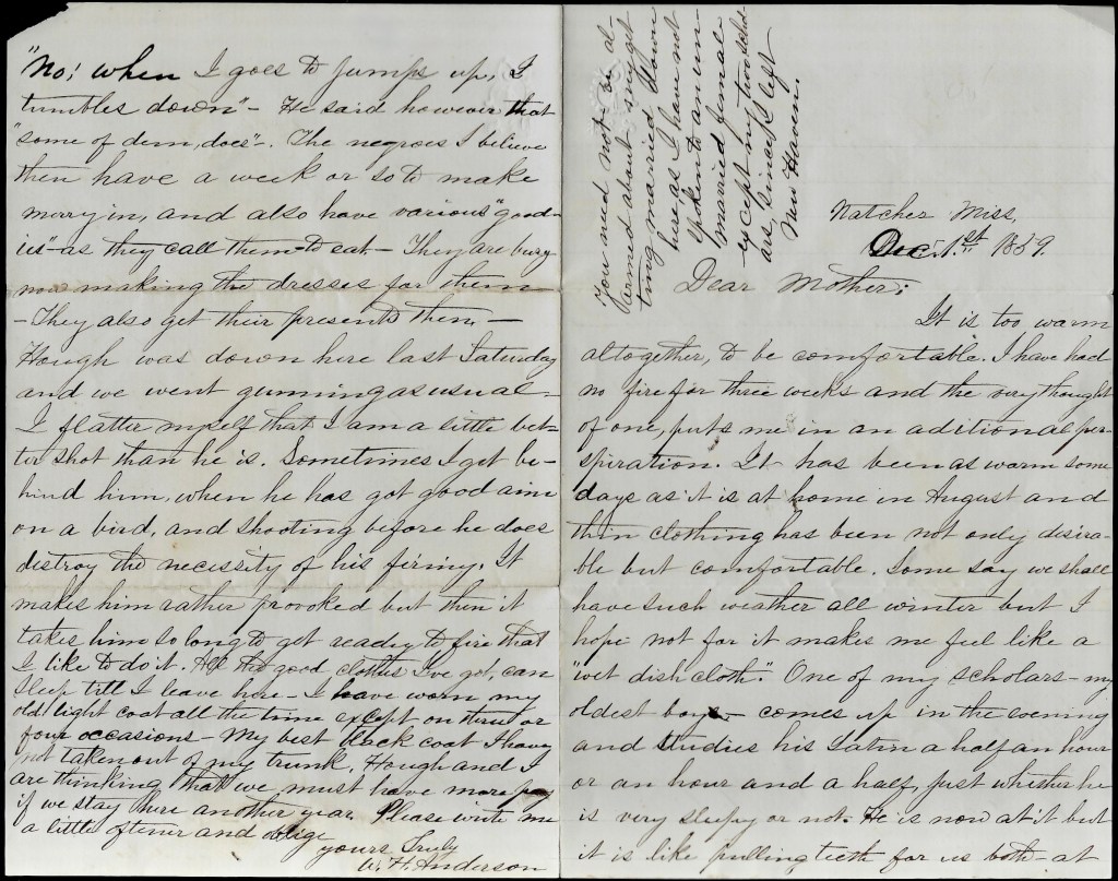 During his time in Mississippi, William wrote numerous letters home to his parents and to his future wife Mary A. Hine. He arrived at Bennett’s Retirement Plantation in early September 1859, and shortly thereafter settled in at David P. Williams’ Sligo Plantation. In his letters from Natchez archived at the University of Michigan, William described his relative isolation, loneliness, teaching and wages, corporal punishment, thoughts on slavery and the enslaved men and women on the plantation, games he played with his scholars, travel between the Sligo and Retirement plantations, and leisure activities such as hunting and horseback riding. In late December 1859, he provided a lengthy description of a (largely) steamboat trip to New Orleans with his students for Christmas.